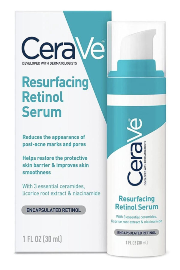 CeraVe Resurfacing Retinol Serum is a dermatologist-developed formula designed to reduce the appearance of post-acne marks and pores while restoring the protective skin barrier and improving skin smoothness. Enriched with three essential ceramides, licorice root extract, and niacinamide, this encapsulated retinol serum helps to: